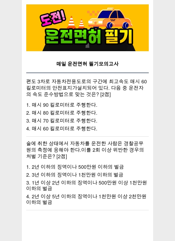 운전면허증 필기시험을 도전하는 사람들에게 모의고사 문제를