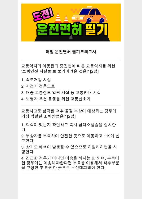 오늘의 운전면허 필기 공부 퀴즈 모의고사를 공개합니다.