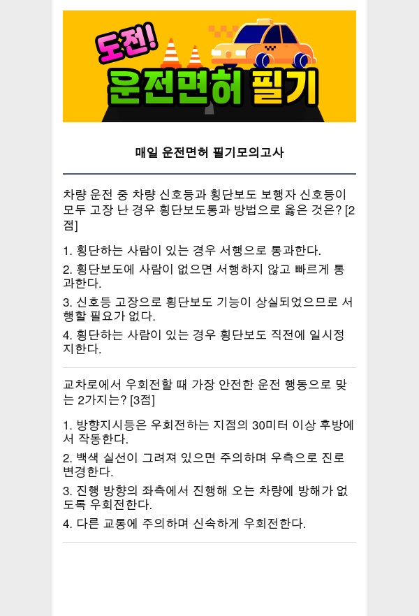 오늘의 운전면허 필기 공부 퀴즈 모의고사를 공개합니다.