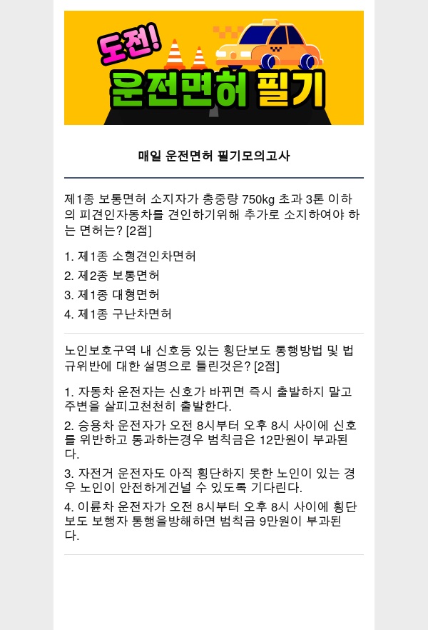 오늘의 운전면허 필기 공부 퀴즈 모의고사를 공개합니다.