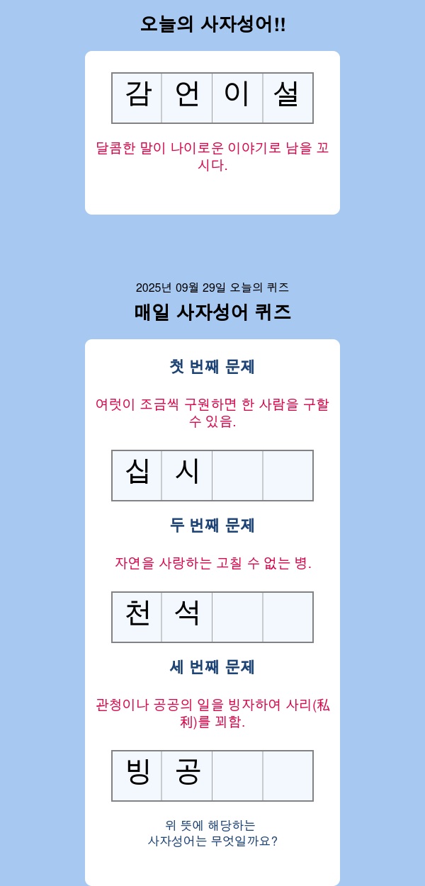 오늘의 사자성어 공부 퀴즈 오늘의 문제를 공개합니다.