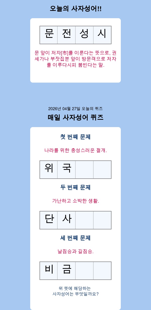 오늘의 사자성어 공부 퀴즈 오늘의 문제를 공개합니다.