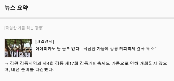 → 강원 강릉지역의 제4회 강릉 제17회 강릉커피축제도 가뭄으로 인해 개최되지 않으며, 내년 준비를 다짐했다.