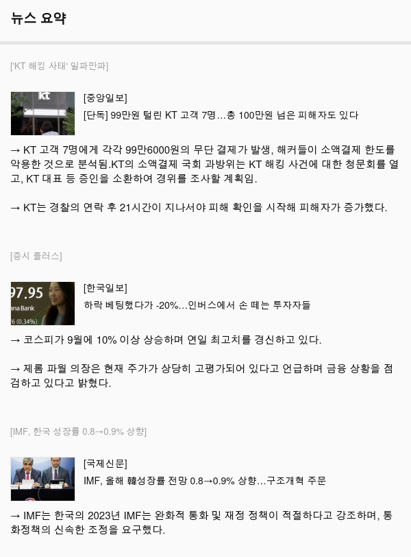 → KT 고객 7명에게 각각 99만6000원의 무단 결제가 발생, 해커들이 소액결제 한도를 악용한 것으로 분석됨.KT의 소액결제 국회 과방위는 KT 해킹 사건에 대한 청문회를 열고, KT 대표 등 증인을 소환하여 경위를 조사할 계획임.