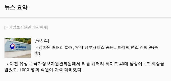 → 대전 유성구 국가정보자원관리원에서 리튬 배터리 화재로 40대 남성이 1도 화상을 입었고, 100여명의 직원이 자력 대피했다.