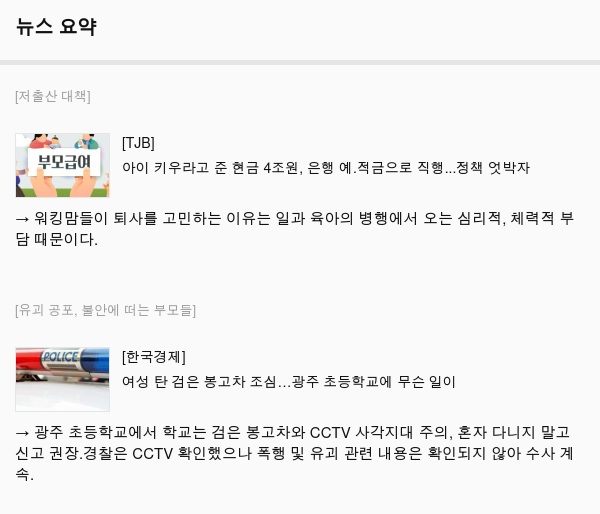 → 워킹맘들이 퇴사를 고민하는 이유는 일과 육아의 병행에서 오는 심리적, 체력적 부담 때문이다.