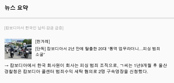 → 캄보디아에서 한국 회사원이 회사는 피싱 범죄 조직으로, ㄱ씨는 1년9개월 후 울산경찰청은 캄보디아 콜센터 범죄수익 세탁 혐의로 2명 구속영장을 신청했다.