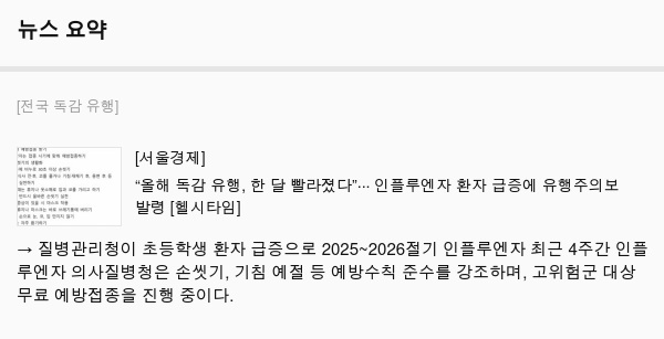 → 질병관리청이 초등학생 환자 급증으로 2025~2026절기 인플루엔자 최근 4주간 인플루엔자 의사질병청은 손씻기, 기침 예절 등 예방수칙 준수를 강조하며, 고위험군 대상 무료 예방접종을 진행 중이다.