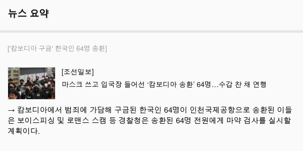 → 캄보디아에서 범죄에 가담해 구금된 한국인 64명이 인천국제공항으로 송환된 이들은 보이스피싱 및 로맨스 스캠 등 경찰청은 송환된 64명 전원에게 마약 검사를 실시할 계획이다.
