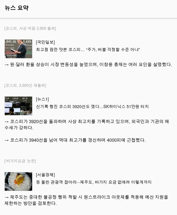 → 코스피가 3920선을 돌파하며 사상 최고치를 기록하고 있으며, 외국인과 기관의 매수세가 강하다.
