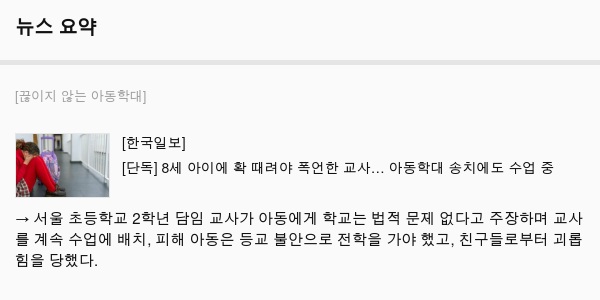 → 서울 초등학교 2학년 담임 교사가 아동에게 학교는 법적 문제 없다고 주장하며 교사를 계속 수업에 배치, 피해 아동은 등교 불안으로 전학을 가야 했고, 친구들로부터 괴롭힘을 당했다.