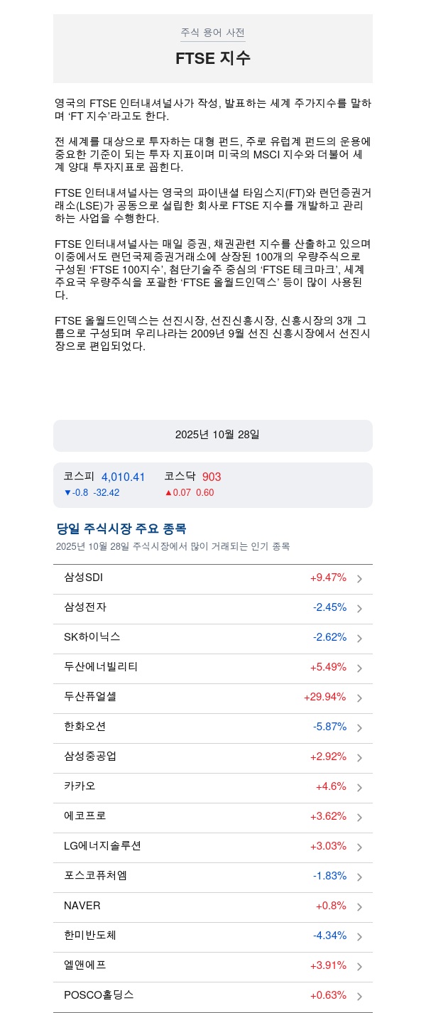 FTSE 지수 – 주식용어 해설과 2025년10월28일 주식 추세