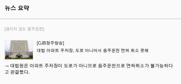 → 대법원은 아파트 주차장이 도로가 아니므로 음주운전으로 면허취소가 불가능하다고 판결했다.
