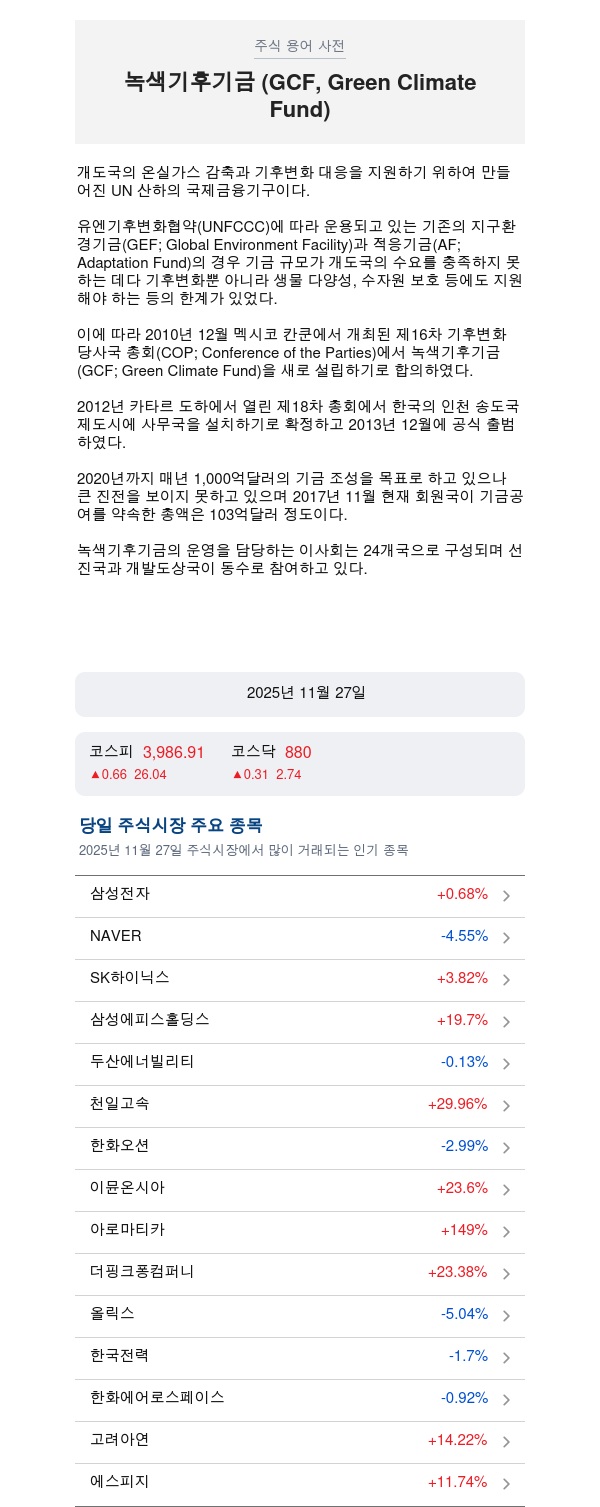 녹색기후기금 (GCF, Green Climate Fund) 용어 설명과 2025년11월27일 주식 추세