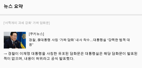 → 경찰이 이재명 대통령을 사칭한 유포된 담화문은 대통령실은 해당 담화문이 발표된 적이 없으며, 내용이 허위라고 공식 발표했다.