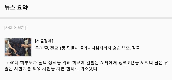 → 40대 학부모가 딸의 성적을 위해 학교에 검찰은 A 씨에게 징역 8년을 A 씨의 딸은 유출된 시험지를 외워 시험을 치른 혐의로 기소됐다.