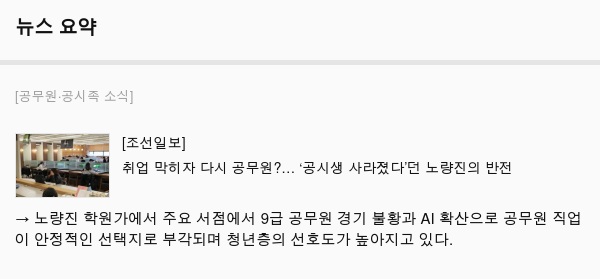 → 노량진 학원가에서 주요 서점에서 9급 공무원 경기 불황과 AI 확산으로 공무원 직업이 안정적인 선택지로 부각되며 청년층의 선호도가 높아지고 있다.
