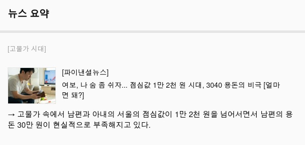 → 고물가 속에서 남편과 아내의 서울의 점심값이 1만 2천 원을 넘어서면서 남편의 용돈 30만 원이 현실적으로 부족해지고 있다.