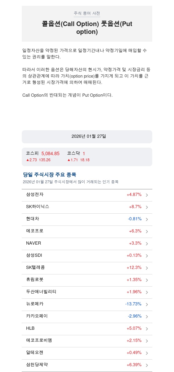 콜옵션(Call Option) 풋옵션(Put option) 언어 소개와 2026년01월27일 주식 분석