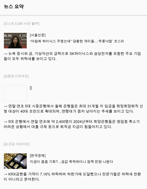 → 뉴욕 증시와 금, 가상자산의 급락으로 SK하이닉스와 삼성전자를 포함한 주요 기업들이 모두 하락세를 보이고 있다.
