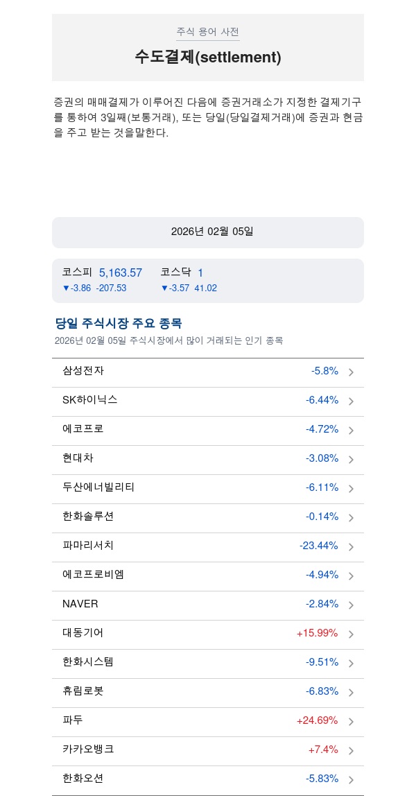 수도결제(settlement) – 주식용어에 대한 이해와 2026년02월05일 인기종목 추천