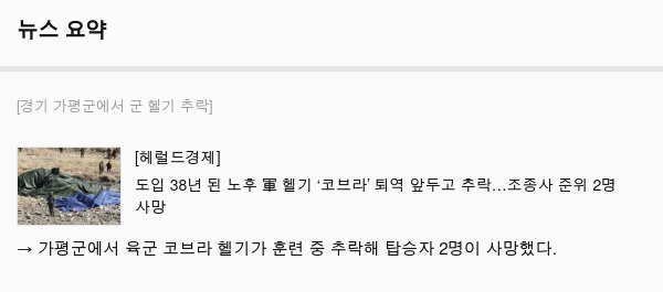 → 가평군에서 육군 코브라 헬기가 훈련 중 추락해 탑승자 2명이 사망했다.