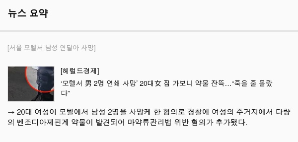 → 20대 여성이 모텔에서 남성 2명을 사망케 한 혐의로 경찰에 여성의 주거지에서 다량의 벤조디아제핀계 약물이 발견되어 마약류관리법 위반 혐의가 추가됐다.