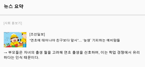→ 부모들은 자녀의 출생 월을 고려해 연초 출생을 선호하며, 이는 학업 경쟁에서 유리하다는 인식 때문이다.