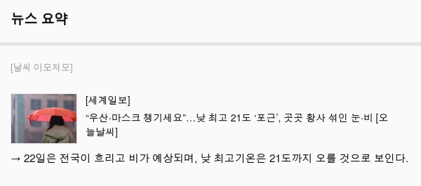 → 22일은 전국이 흐리고 비가 예상되며, 낮 최고기온은 21도까지 오를 것으로 보인다.