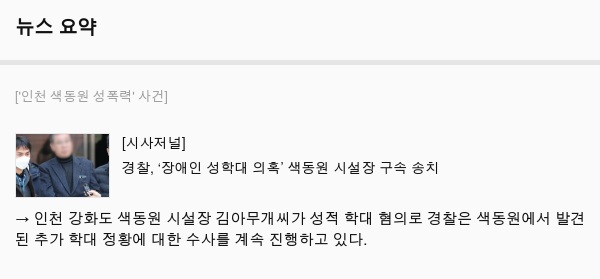 → 인천 강화도 색동원 시설장 김아무개씨가 성적 학대 혐의로 경찰은 색동원에서 발견된 추가 학대 정황에 대한 수사를 계속 진행하고 있다.