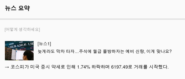 → 코스피가 미국 증시 약세로 인해 1.74% 하락하며 6197.49로 거래를 시작했다.