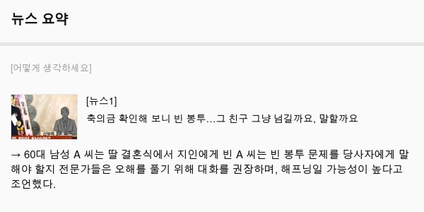 → 60대 남성 A 씨는 딸 결혼식에서 지인에게 빈 A 씨는 빈 봉투 문제를 당사자에게 말해야 할지 전문가들은 오해를 풀기 위해 대화를 권장하며, 해프닝일 가능성이 높다고 조언했다.