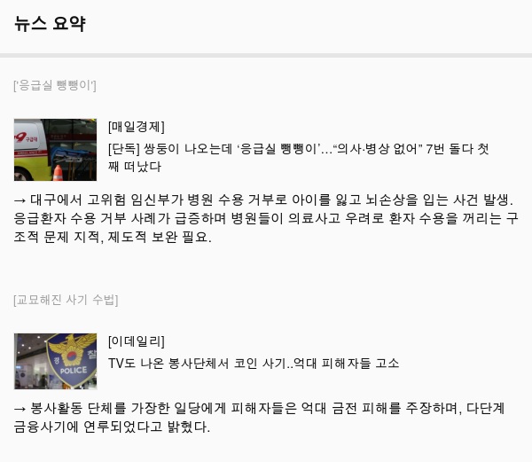 → 대구에서 고위험 임신부가 병원 수용 거부로 아이를 잃고 뇌손상을 입는 사건 발생.응급환자 수용 거부 사례가 급증하며 병원들이 의료사고 우려로 환자 수용을 꺼리는 구조적 문제 지적, 제도적 보완 필요.