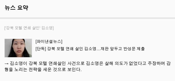 → 김소영이 강북 모텔 연쇄살인 사건으로 김소영은 살해 의도가 없었다고 주장하며 감형을 노리는 전략을 세운 것으로 보인다.