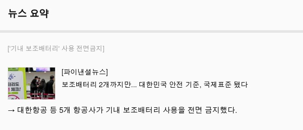 → 대한항공 등 5개 항공사가 기내 보조배터리 사용을 전면 금지했다.