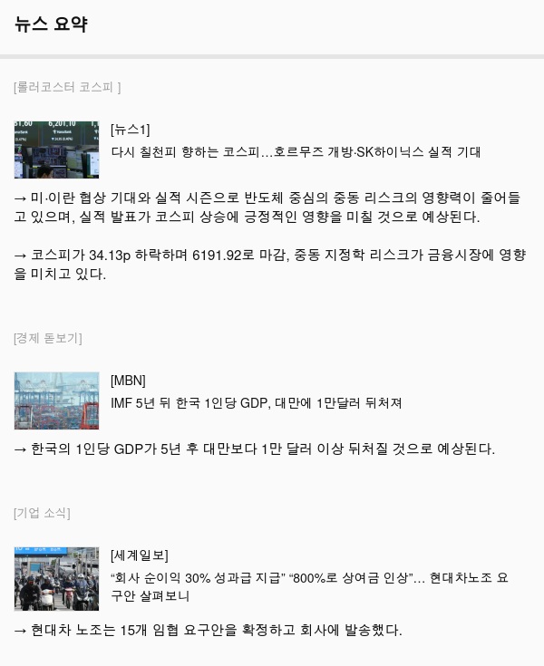 하루 동안 벌어진 주요 사건을 경제와 사회 이슈 중심으로 간략하게 정리한 글입니다. 정보를 빠르게 습득하여 시간을 절약하세요.