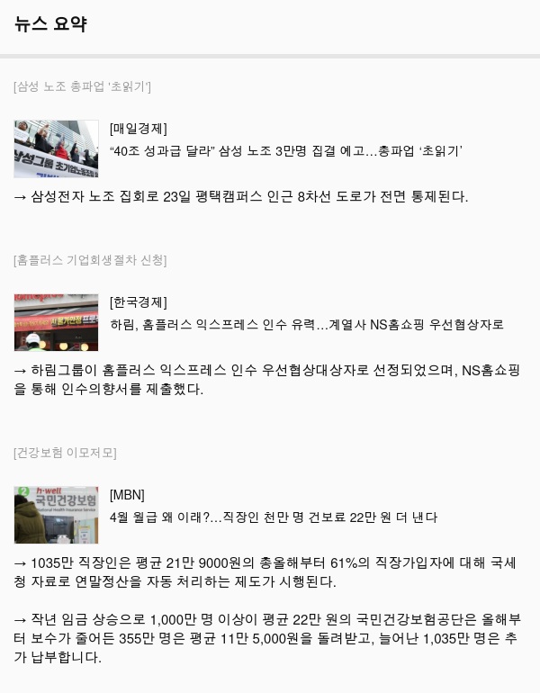 → 삼성전자 노조가 5월 노조의 압박으로 비조합원들도 노조는 파업으로 20조~30조원의 생산 차질이 발생할 것이라며, 글로벌 공급망에 미칠 영향을 우려하고 있다.