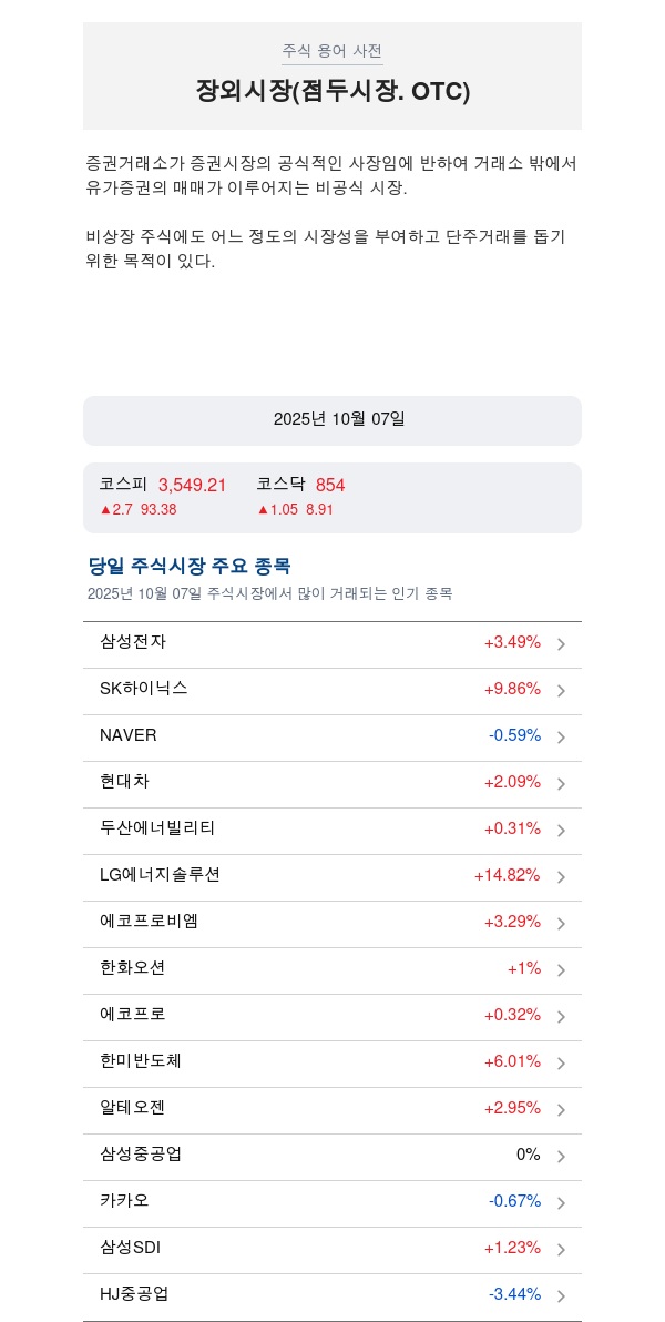 더보기장외시장(점두시장. OTC) 용어 해설과 2025년10월07일 주식 흐름