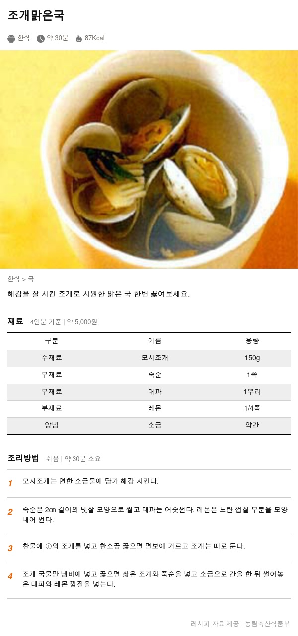 | 주재료 | 모시조개 | 150g |